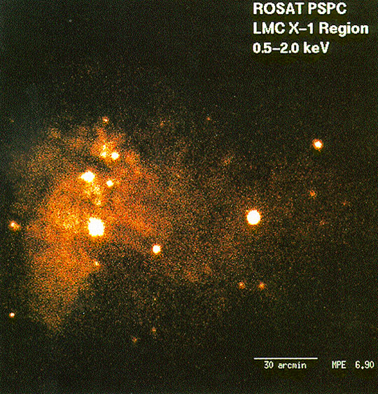 An image taken by ROSAT as an example: the Large Magellanic Cloud at a distance of 170,000 light years. 15 unknown X-ray sources could be found. However, when the entire outer space is photographed, human image evaluation simply can’t keep up with the task anymore.