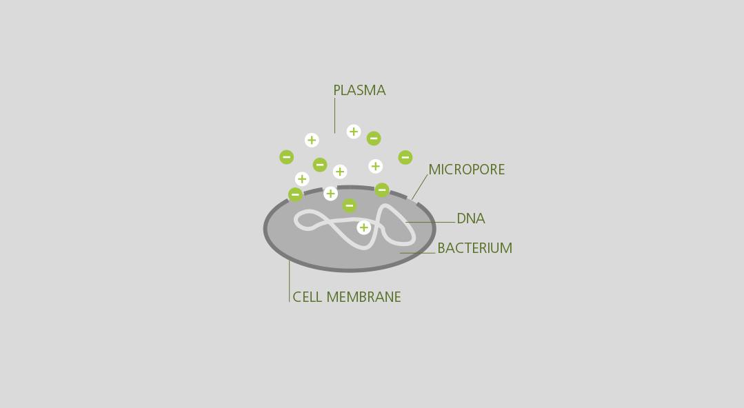 Here’s how it works: the reactive electrons, ions and excited atoms of the plasma tear micropores in the cell membranes of microorganisms, thus enabling the reactive particles of the plasma to enter the cell. There, they come upon the cell’s genome and destroy it. Bacteria, viruses, and fungi die off, even if they are resistant to medication. And how do the human cells survive? The genome of human cells is protected by a cell nucleus membrane and cytological protection mechanisms. The cell is not damaged within the short period of application.