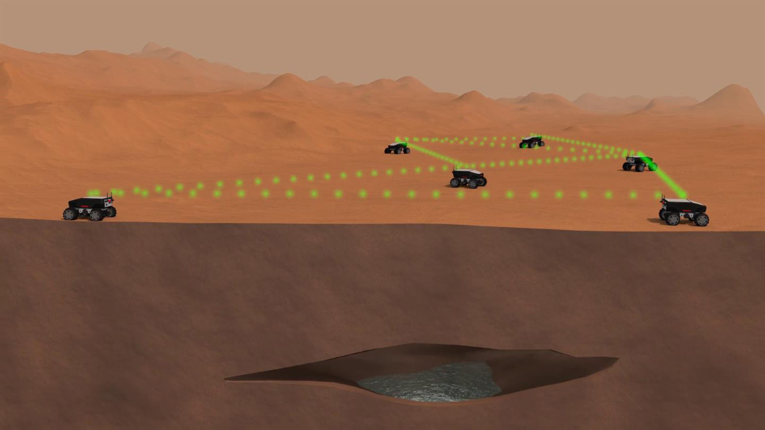 The project VaMEx – CoSMiC (Valles Marineris Explorer ‒ Cooperative Swarm Navigation, Mission and Control), funded by the German Space Agency at DLR, demonstrates that swarms of autonomous rovers, drones, and robots can explore distant worlds, for example to search for traces of life in the huge canyon system Valles Marineris on Mars. The challenge: the swarms are supposed to act autonomously and make decisions. To this end, the individual swarm members have to explore the terrain, exchange information with each other, jointly make measurements – and, first of all, navigate. Navigation in an unknown world? The NavVis technology assists in fully autonomous mapping.