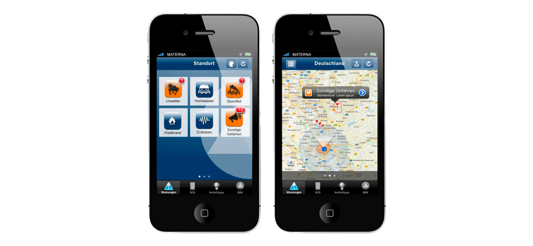 The warning app NINA of the Federal Office of Civil Protection and Disaster Assistance sets off an alarm if the own environment is threatened by a disaster or severe weather – as a warning system running in parallel to sirens and radio. NINA is connected to MoWaS, the modular warning system. The warning message is transmitted by the releasing control centre, well protected against power failure and disaster, via satellite (and, in addition, via cable) and thus reaches the warning systems, like, for example, NINA.