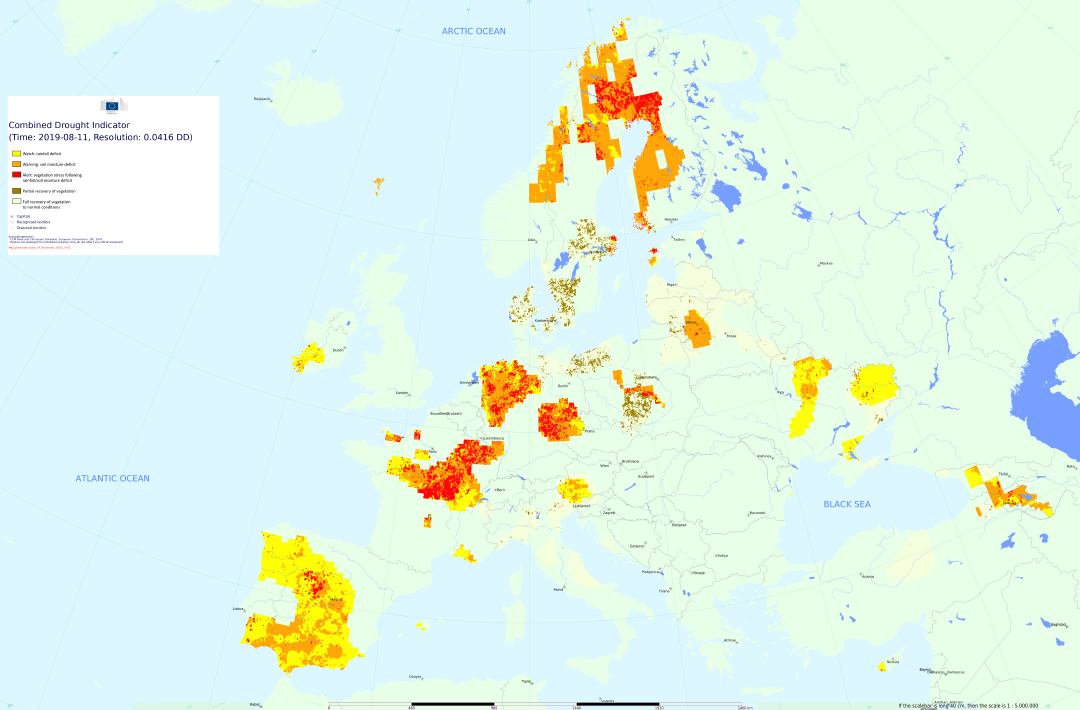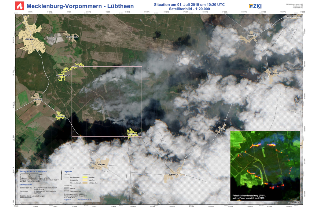 Major fire on a military training area, Mecklenburg-West Pomerania. On June 28, the fire was reported as “extinguished”. However, hot spots sparked new fires. The map is of July 1, 2019: relief forces can see on the map provided by the ZKI, which villages are threatened by the fire, which streets are passable, and first of all, the fire sources and hot spots – since satellites can “see” through clouds and treetops. In this way, relief forces can do better planning. The data come from the Sentinel-2 satellite and show, on the one hand, the area in “true colours” and, on the other hand, as false colour imaging, created with the help of near-infrared channels.