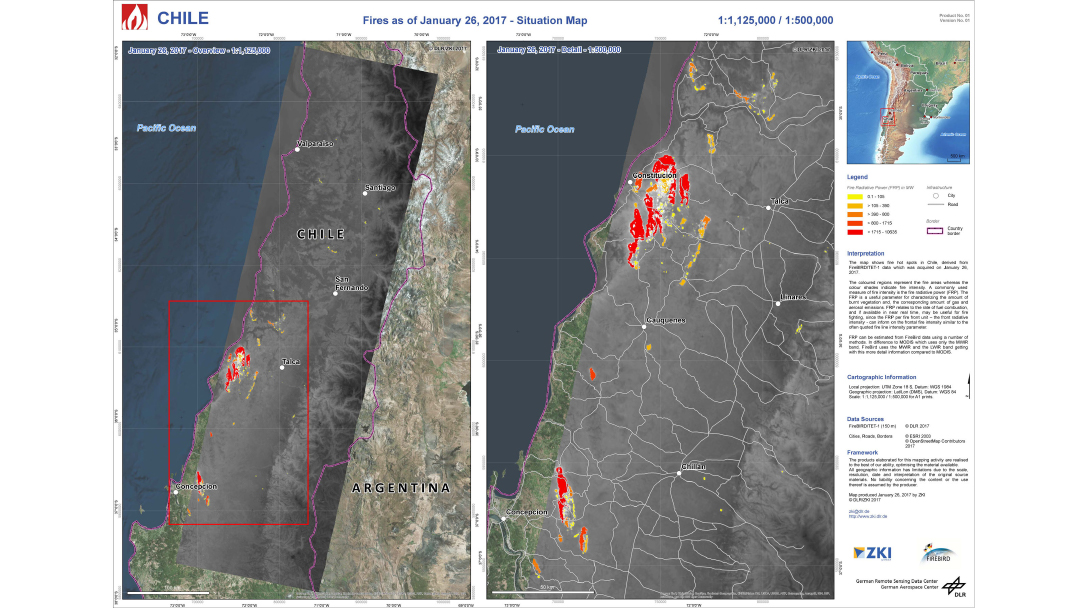 The German satellites TET-1 and BIROS are members of the “FireBIRD” team. The two “firebirds” are flying at an altitude of 520 kilometres and detect forest fires and smaller fires through infrared sensor technology. The aim is not only the detection of fires but most notably the documentation of their spread. In this way, fires can be better researched – and that can contribute to preventing some fires in the future. The data from FireBIRD are also used by the ZKI.