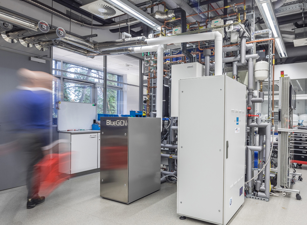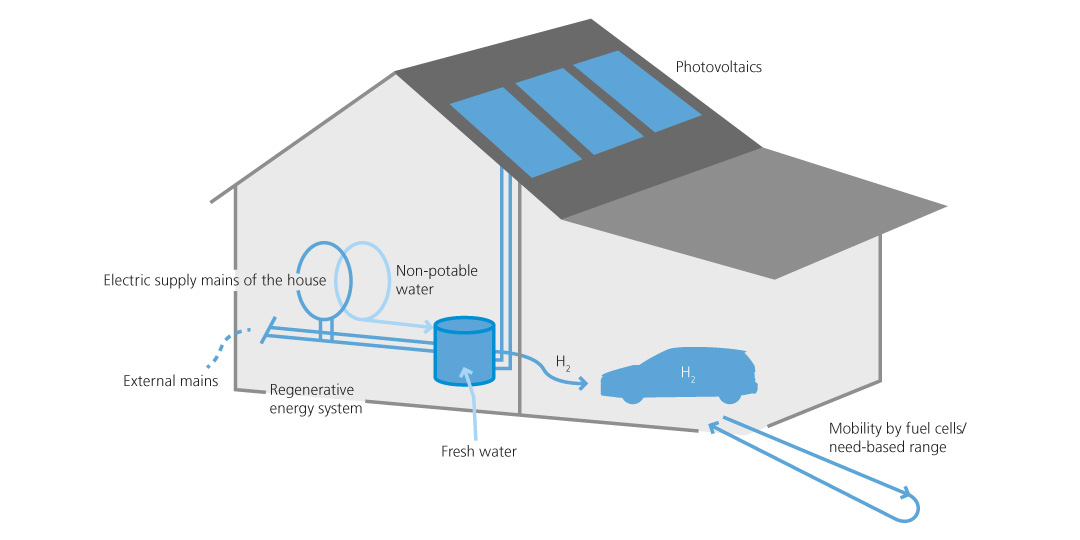 Solar cells on the roof produce power during the day. With the power that is not directly used, hydrogen is produced via electrolysis. This hydrogen is stored in a tank, where it is available for producing power and heat in a fuel cell when there is no sunshine. Or the hydrogen is used for fuelling the car or is fed into the power grid.