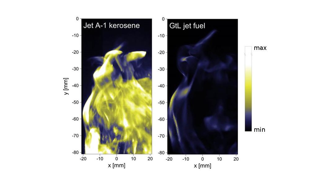 Fossil fuels are made of crude oil, thus containing a variety of different components, many of which, however, are unwanted since they produce soot during combustion. The composition of synthetic fuels, on the other hand, can be perfectly designed. Compared with conventional kerosene (Jet A-1), the synthetically produced flight kerosene of the future (GtL) is significantly cleaner: during combustion, hardly any soot is generated, which makes it environmentally friendly. The picture shows a comparison of the soot radiation of two flames from which the amount of produced soot can be extrapolated. The emission of hazardous substances can be reduced by just adding a designer fuel admixture. DLR is conducting research in order to optimally match designer fuels and engines.
