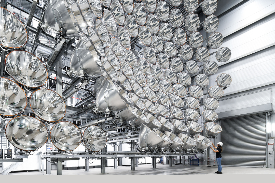 To further develop solar-thermal power plants, researchers depend on location-independent and reproducible tests with sunlight. Since this is difficult to achieve with natural solar irradiance, the DLR Institute of Solar Research in Juelich has developed its own “sun“: Synlight. Since 2017, it has been the largest artificial sun in the world, featuring a capacity of more than 300,000 watts, thus being as powerful as all previous artificial suns worldwide together. Each of the 149 lamps achieves the light intensity of a large cinema projector equalling 10,000 times the natural solar radiation on Earth’s surface. Since Synlight can be divided into three “suns“, many teams from research institutions and companies are given the opportunity to advance solar technology – for instance, for better production of hydrogen or liquid solar fuels.
