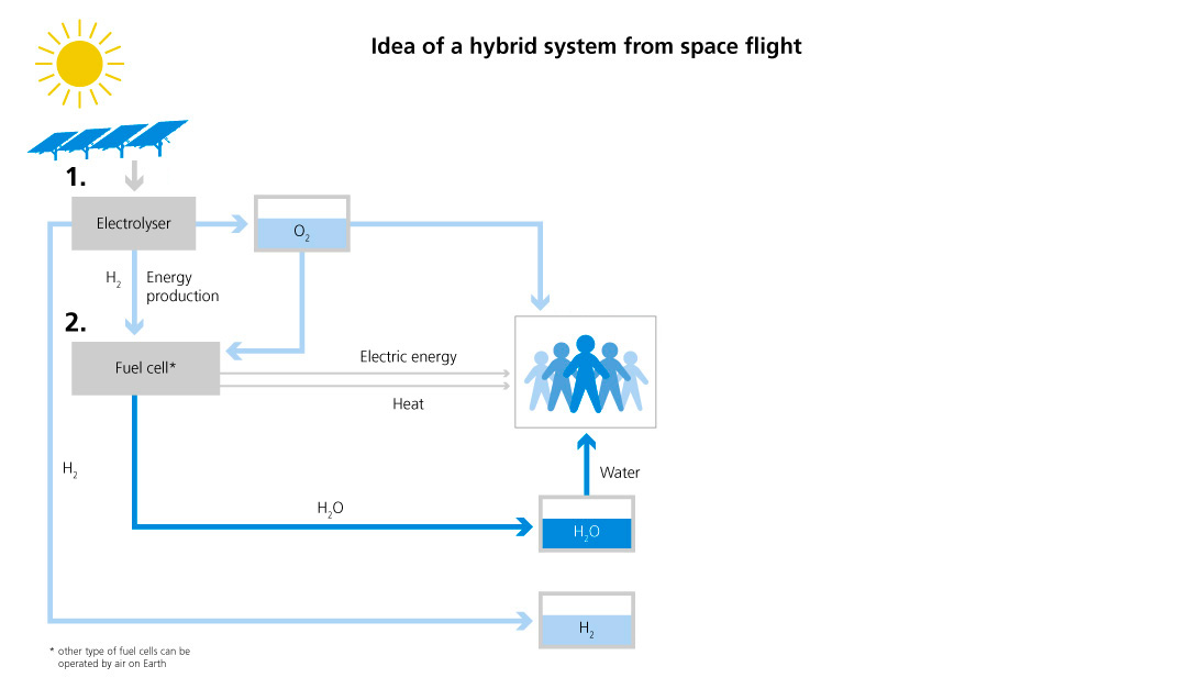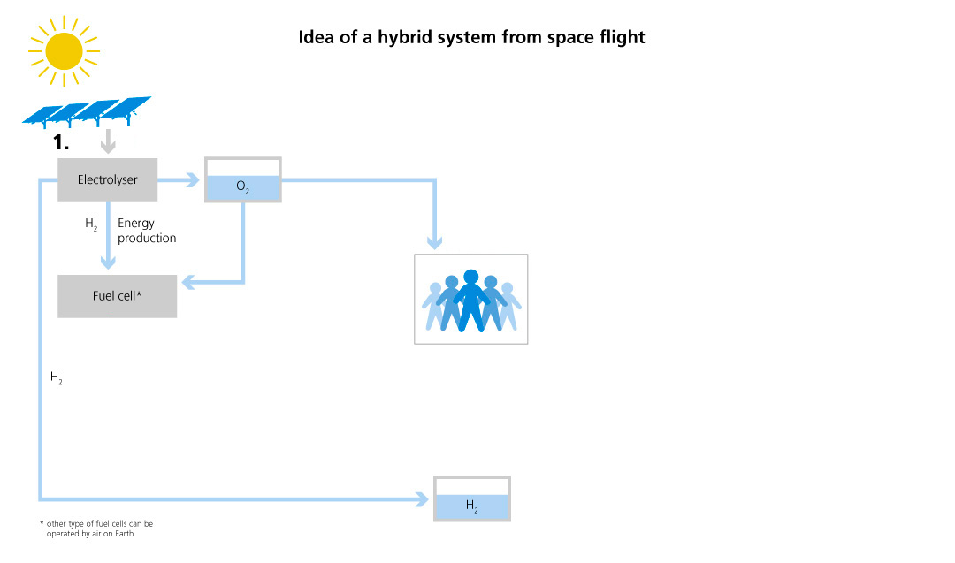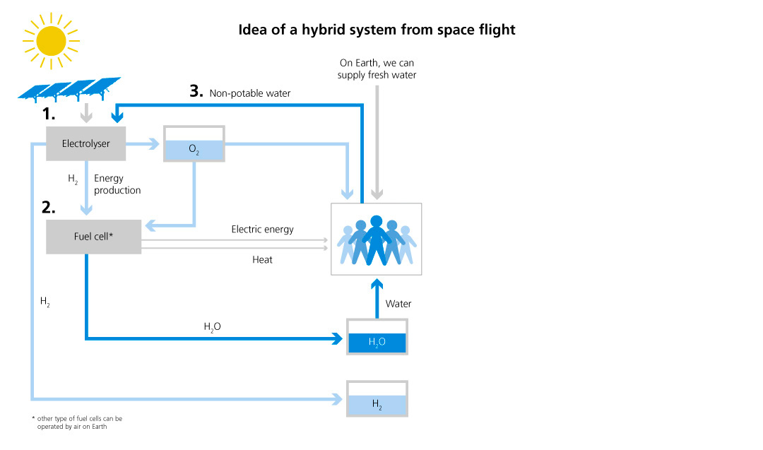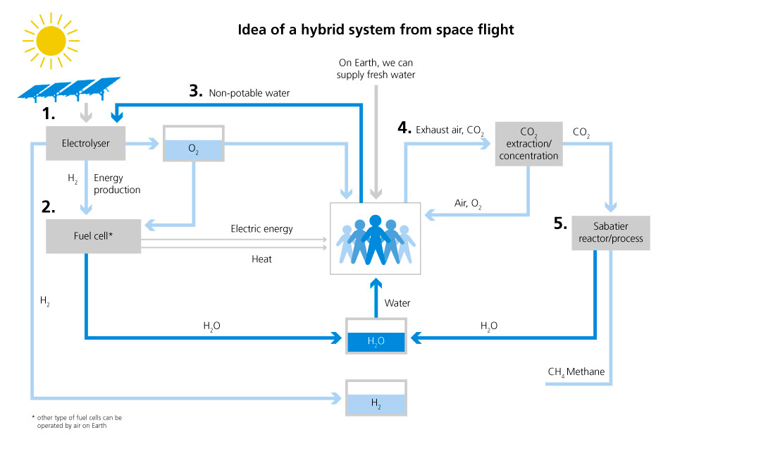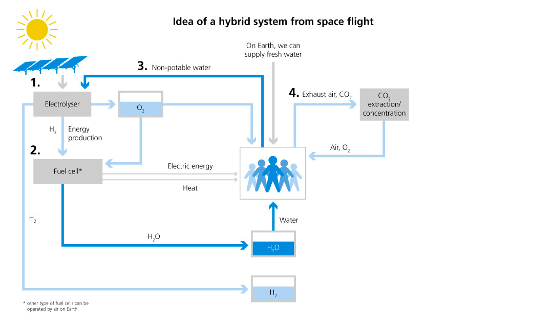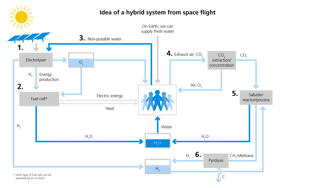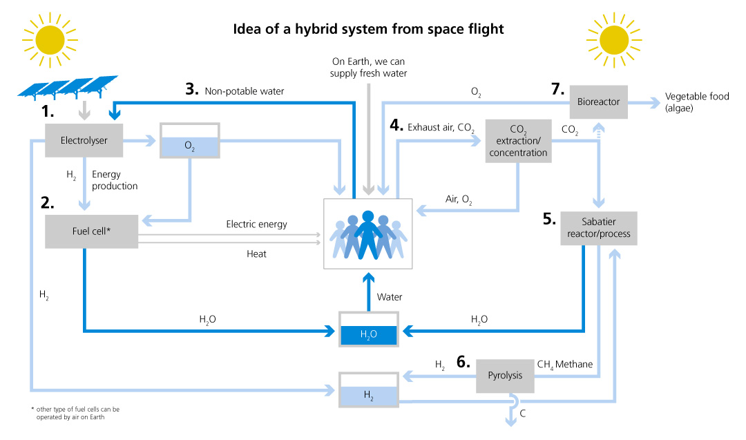 How will, for example, a crewed Mars station get energy and many other things? Without a petrol station, a water source, and a supermarket? The idea: the closed loop of a life support system based on reversible hydrogen systems. Instead of carrying huge volumes of hydrogen (H2) and oxygen (O2) to Mars, the “provisions” could mainly consist of water. Solar cells generate power on site. Via electrolysis, the water is split into hydrogen (H2) and oxygen (O2). In a fuel cell, heat and water are generated from these two components. Power, heat, air, and water – in a perpetual cycle. Algae cultures could be used to produce additional oxygen – and food could be obtained from these cultures at the same time. Research on such closed systems is intensively fostered by the German Space Agency at DLR, since they are also interesting for applications on Earth. They probably might be the solution to the storage problem of renewable energies.