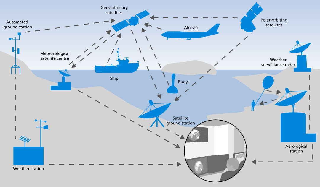 Before there were weather satellites, meteorologists had to laboriously collect and evaluate data such as air pressure and temperature from weather stations on the ground, every now and then complemented by data from weather balloons. Ever since weather satellites have existed, the weather forecasts have significantly improved. Now it is easier for meteorologists to acquire the data and to observe the complete weather in 3D around the world, at all air layers and also on the ground and above the sea. Assisted by numerical models and supercomputers, today weather forecasts are made from this data.