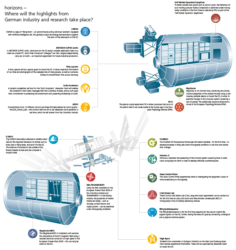 The second assignment of Alexander Gerst on the ISS was the “horizons” mission in 2018. Numerous experiments with German participation formed part of the mission – that is high-end space research for Germany. Research under microgravity conditions? With humans on board a costly space station? Why? Plain and simple: sometimes gravity impedes research. For this reason, a space station is the only place where we can research on issues that could hitherto not be researched on due to gravity on Earth. And from that the technical achievements of the near and remote future emerge.