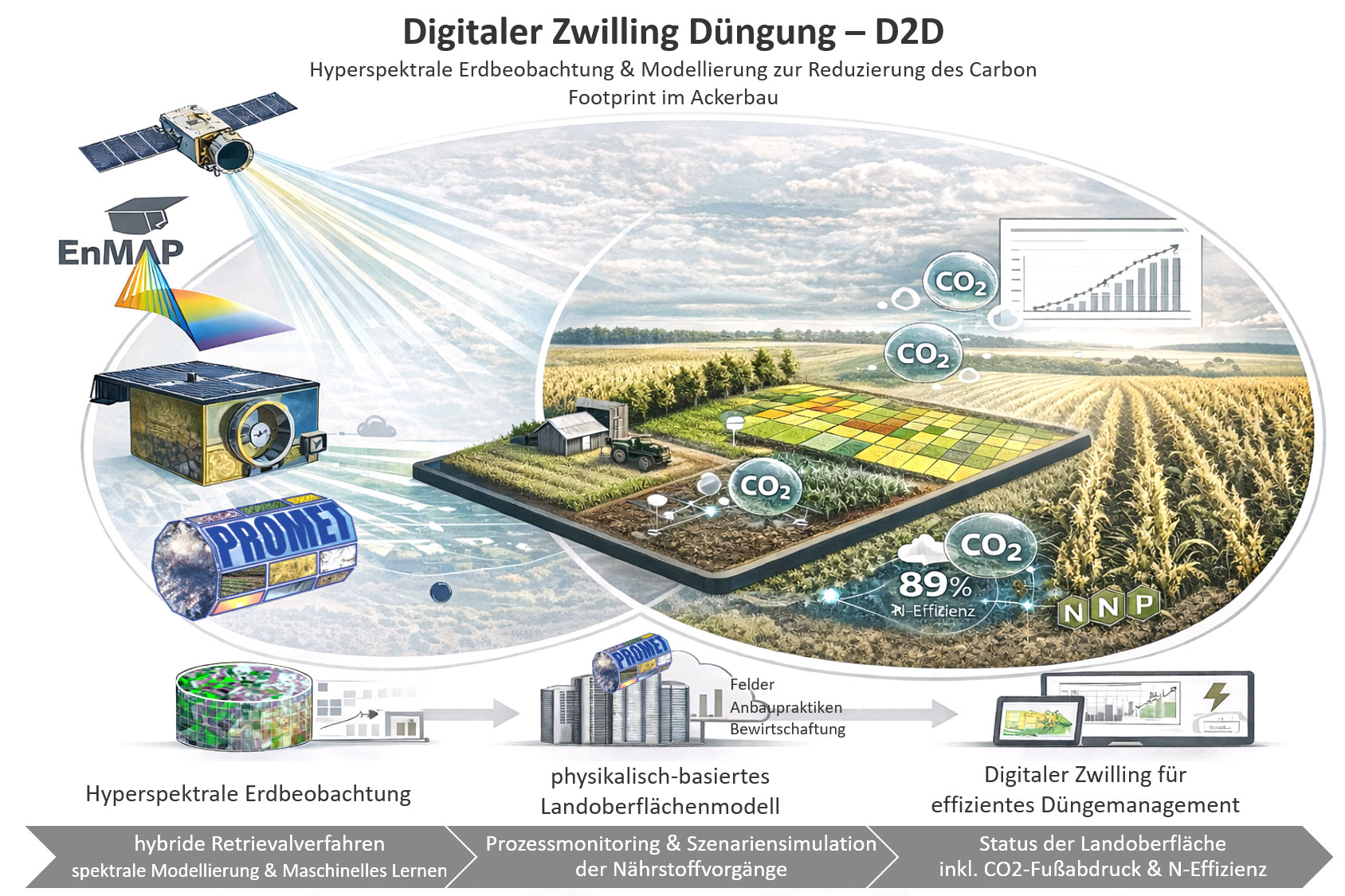 Technisch nutzt D2D neuste Erdbeobachtungsdaten hyperspektraler Sensoren, deren Flächeninformationen mit Hilfe hybrider Retrievalverfahren, bei denen spektrale Modellierung und Maschinelles Lernen kombiniert werden, nutzbar gemacht werden. Die hyperspektral abgeleiteten Informationen speisen wiederum ein physikalisches Landoberflächenmodell, wodurch ein genaues Prozessmonitoring der Nährstoffvorgänge auf landwirtschaftlichen Feldern möglich wird.